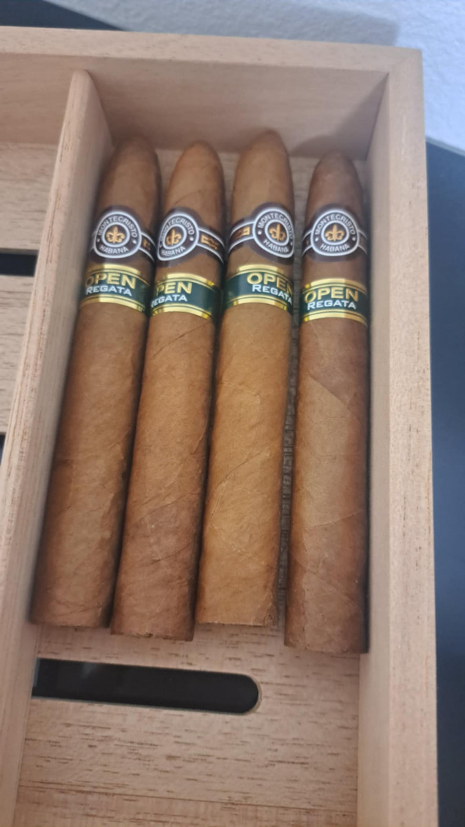 Kubánské doutníky Montecristo Regata Open. Oblíbené ručně balené doutníky Regata z řady Open jsou vyráběné z nejlepších tabáků z oblasti Vuelta Abajo. Výborný doutník ve formátu Piramides se špičatou hlavou je typický svojí ovocnou a současně krémovou chutí s jemnými tóny cedru, koření a také kakaa. Doba hoření je cca 45-60 minut. Doutníky Montecristo patří mezi jedny z nejprodávanějších kubánských doutníků na světě díky jejich kvalitě a výborné chuti. Charakteristická je jejich výrazná středně silná až silná chuť a zapamatovatelná krabice s motivem známého románu Hrabě Monte Christo. Doutníky Montecristo Open Regata jsou balené po 20 ks v originální cedrové krabici s logem Montecristo a prodávají se pouze po celém balení.